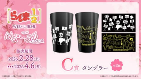 上位賞には、描き起こしイラストをふかふかの抱き心地で立体化したぬいぐるみ、美麗なイラストを大きく飾れるA3クリアポスター、キャラ単体を飾れるクリアポスターコレクション、劇中の玄馬(パンダ)の立て札やオノマトペがデザインされたタンブラーなど、豪華なラインナップを提供します。