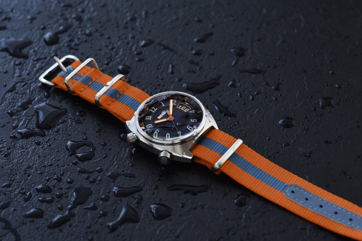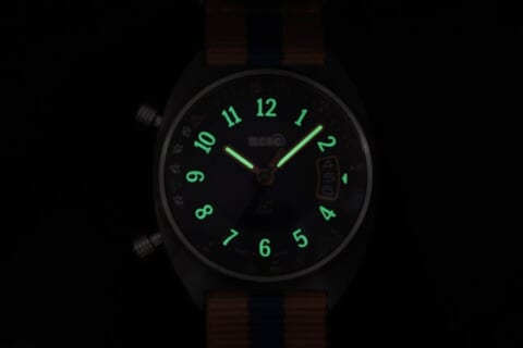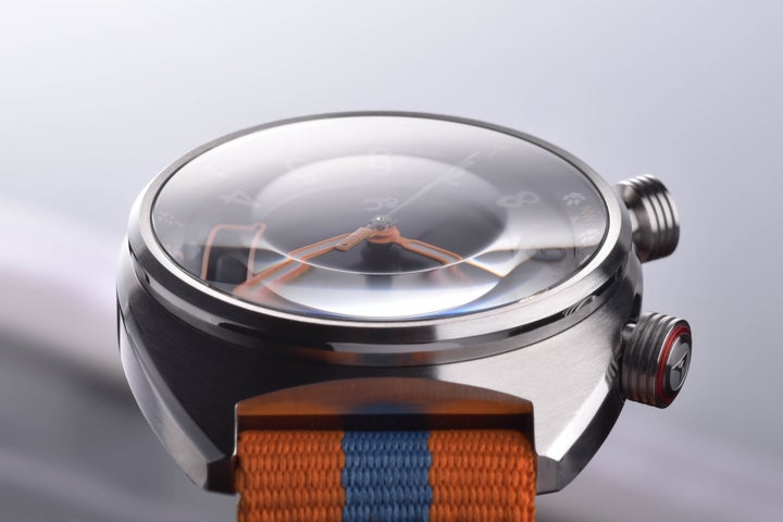 文字盤にはグラデーションダイヤルを採用し、カメラレンズを思わせるドームガラスを組み合わせることで、奥行きのある視覚効果を演出します。秒針には劇中に登場する360度カメラのモチーフがあしらわれ、丸みのあるアラビア数字インデックスが遊び心を添えます。撮影やライディング時に邪魔にならない逆リューズ構造や、簡単に付け替えが可能なNATOバンドも特長です。