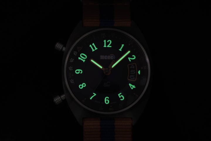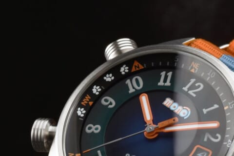 太陽と時刻から方角を教えてくれる内転方位計を搭載しており、そこには“たいしょうの足跡”がそっと描かれています。暗い場所でも視認性を確保するスーパールミナス蓄光と、100M防水の安心感により、週末のアウトドアシーンでも活躍します。