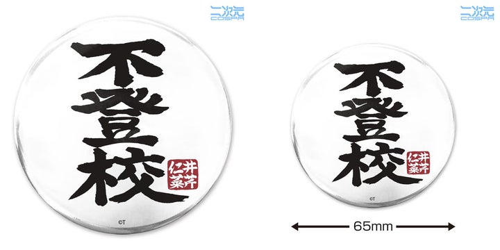 キャラクターのセリフ「不登校」「脱退」「嘘つき」「ツンデレ」「酒豪」デザインのほか、「トゲナシトゲアリ」「ダイヤモンドダスト」「新川崎(仮)」「beni-shouga」の全9種が登場します。直径65mmの大きめサイズで、バッグや洋服などお気に入りの場所に取り付けて楽しめます。