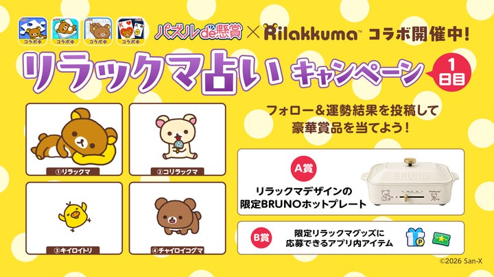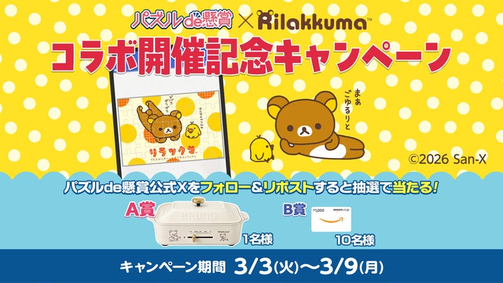オーテ株式会社が運営する「パズルde懸賞」シリーズは、人気キャラクター「リラックマ」とのスペシャルコラボイベントを2026年3月3日(火)より4アプリにて同時開催します。限定デザインのBRUNO家電などが懸賞品として登場する予定です。様々なリラックマグッズ獲得の機会を提供します。