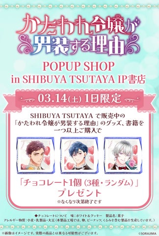 株式会社ソラジマは、人気作品『かたわれ令嬢が男装する理由』のPOP UP SHOPをSHIBUYA TSUTAYA IP書店で開催します。ホワイトデーをコンセプトにした特別企画で、限定グッズや購入特典が登場します。