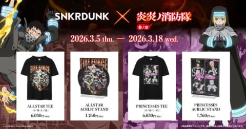 2026年3月5日より、TVアニメ『炎炎ノ消防隊 参ノ章』とファッション&コレクティブル マーケットプレイス「スニーカーダンク(スニダン)」が初のコラボレーションアイテムを販売します。