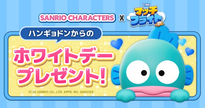 2026年3月14日(土)12:00 ~ 3月14日(土)23:59の期間中、ハンギョドンからのホワイトデープレゼントを配付します。LINE マッチフライトのLINE公式アカウントからプレゼントを受け取れます。