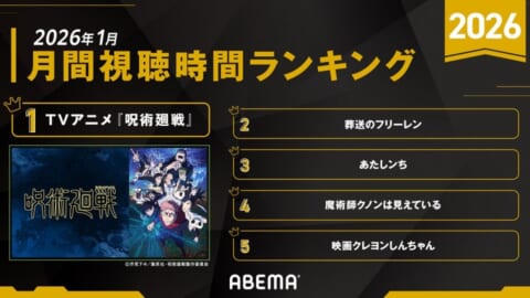 2026年1月、ABEMAアニメの総視聴時間が前年同月を上回り伸長し、その月間視聴時間ランキング上位5作品が発表されました。TVアニメ『呪術廻戦』が1位を獲得しました。