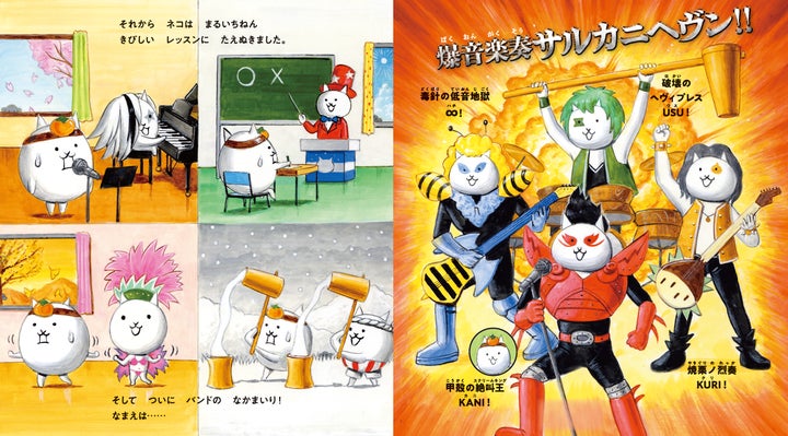 本書はスマートフォンアプリ『にゃんこ大戦争』に登場する「さるかに合戦」を主人公とした、初の描き下ろし絵本です。天才子役のネコとサルは、ある日喧嘩をしてしまいました。ネコが「これからは音楽にゃ」と言い出し、怒ったサルが柿を投げつけてしまったのです。やがてネコはヘヴィメタルバンド「サルカニヘヴン」で「甲殻の絶叫王 KANI」として大活躍しますが、それも長くは続きません。