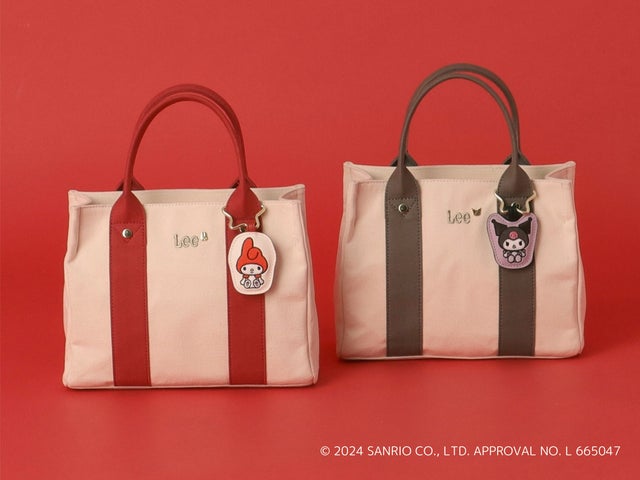 マイメロディとクロミのキュートな刺繍チャームが付いたトートバッグです。フロントには「Lee」ロゴがあしらわれ、その隣にはキャラクターシルエットのスタッズがさりげないワンポイントになっています。A5サイズが収納可能で実用性も兼ね備えています。