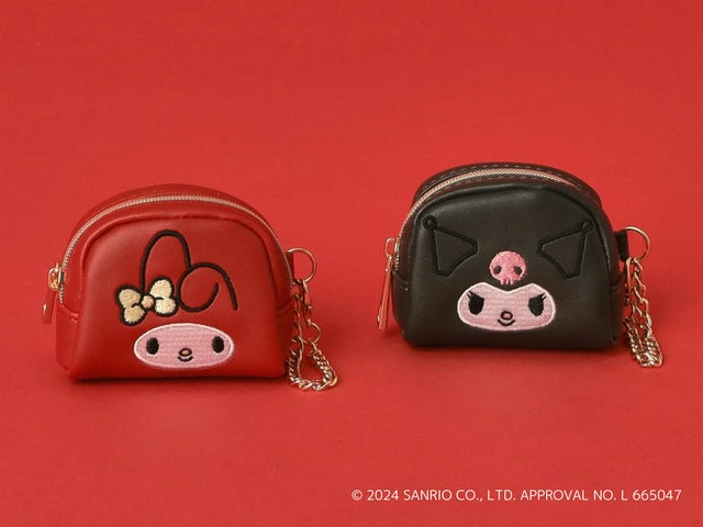 マイメロディとクロミのお顔を刺繍したミニサイズのポーチです。コロンとしたフォルムがかわいらしく、イヤホンや小物の収納に適しています。チェーン付きのため、バッグチャームとしても使用できます。