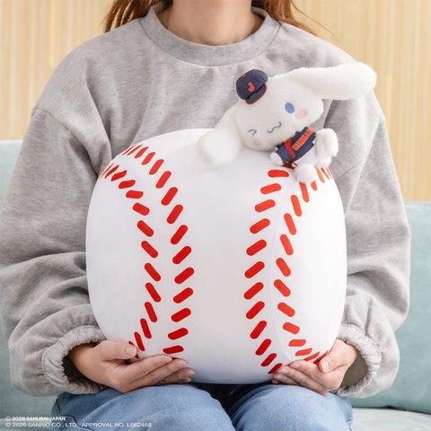約38cm。野球ボールにちょこんと乗ったシナモロールが可愛らしいクッションです。最後のくじを引いた方にプレゼントします。