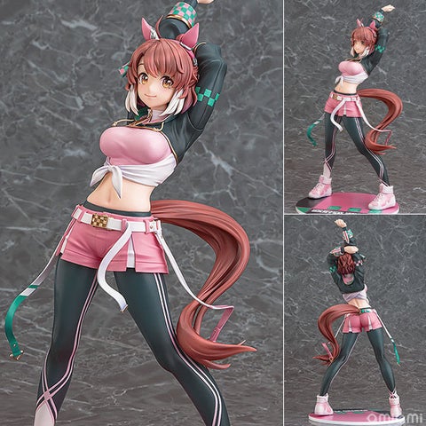 ダンツフレームは、勝負服「まんなか◎スポットライト」を着用し、笑顔でストレッチに励む姿で立体化しました。大きく腕を伸ばしたポーズは、レース前のひとときやトレーニング中のワンシーンを切り取ったかのような自然体の魅力を表現しています。しなやかにひねられた腰のラインや安定感のある脚部のボリューム感、流れる尻尾によって、健康的で躍動感のあるシルエットが生み出されています。