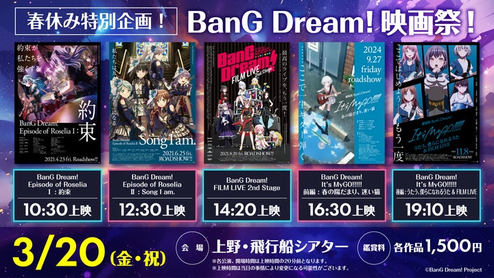 ブシロードムーブは、2026年3月20日(金・祝)に上野・飛行船シアターにて『春休み特別企画!BanG Dream! 映画祭!』を開催します。計5作品を一挙上映し、チケットは現在販売中です。