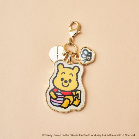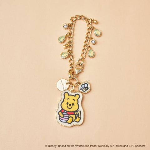 プーさんと仲間たちのアートが金具に落とし込まれたバッグチャームです。ハチが揺れる可愛らしいデザインで、チェーン部分にははちみつをイメージしたイエローのビジューとパールを施し、キラキラとした高級感を演出します。