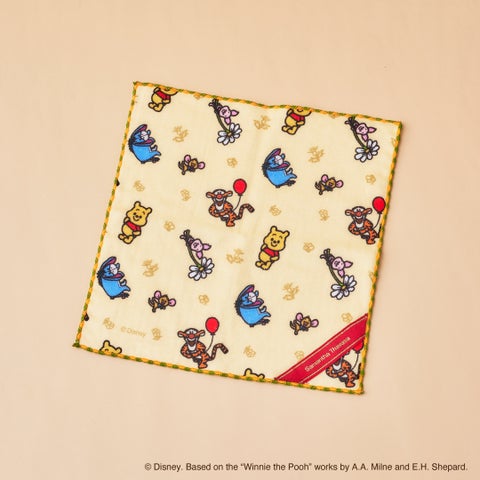 バッグの裏地にも使用されている、オリジナルの総柄をデザインしたハンカチです。プーさんと仲間たちの総柄がポップで可愛らしい雰囲気を醸し出します。