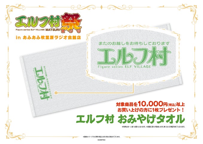イベント期間中、対象商品を10,000円(税込)以上購入した方には、特典として「エルフ村 おみやげタオル」を1枚プレゼントします。特典は一人1点限りで、無くなり次第配布を終了します。