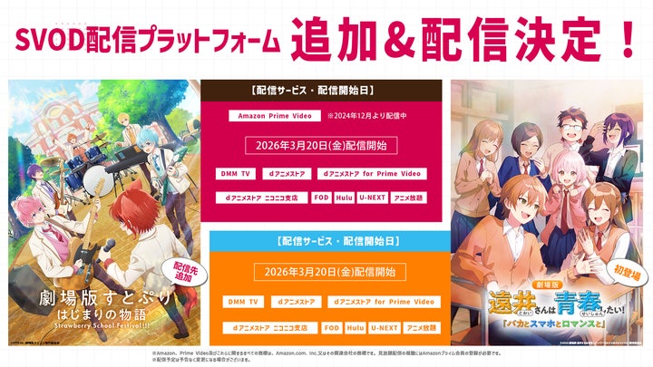 『劇場版すとぷり はじまりの物語 ~Strawberry School Festival!!!~』と『劇場版遠井さんは青春したい!「バカとスマホとロマンスと」』は、2026年3月20日(金)より各SVODサービスで配信を開始します。この機会に、ご自身の好きなプラットフォームで視聴をお楽しみください。
