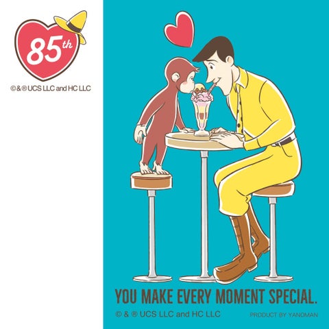 ジョージと黄色いおじさんが向き合ってパフェを食べている姿に胸キュンする幸せいっぱいの一枚です。