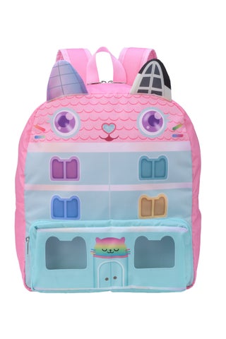 「プラチナムザッカドールハウスリュック」は、映画に登場するドールハウスをデザインした特別なリュックです。たて約40cm、よこ約32cm、奥行約15cmのサイズで、透明な窓を付けています。