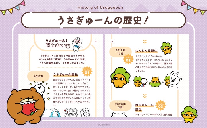 「うさぎゅーん!」とその仲間たちの情報、これまでに発売された人気のスタンプ、SNSで公開されてきたイラストやマンガなどをたっぷりと収載しています。本書を読めば、これまで謎だった「うさぎゅーん!」のあれこれが明らかになり、キャラクターの世界観に深く浸ることができます。