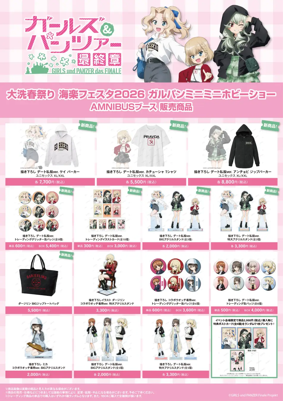 株式会社アルマビアンカが運営する「AMNIBUS」は、2026年3月14日・15日に開催される「大洗春祭り 海楽フェスタ2026 ガルパンミニミニホビーショー」への出展を決定しました。ファン必見の描き下ろしグッズが多数登場します。AMNIBUSブースにて「ガールズ&パンツァー」の新作アイテムを販売します。