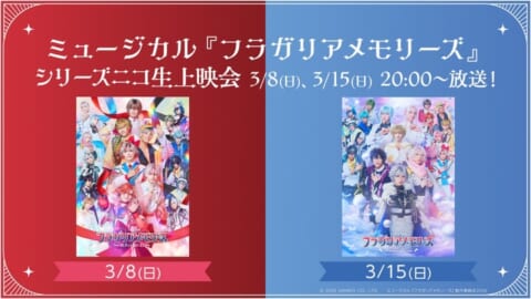 ミュージカル『フラガリアメモリーズ』の過去2作品が、新作公演を記念してニコニコ生放送で無料上映されます。本編終了後には、キャストによる限定特典コメント映像も楽しめます。