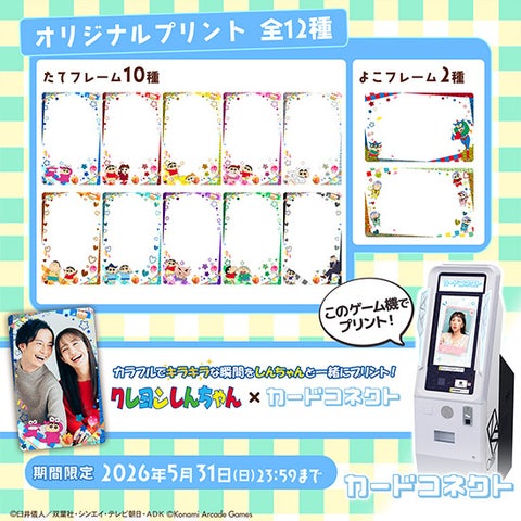 コナミアーケードゲームスは、アミューズメント施設向けカードプリントゲーム機『カードコネクト』にて、人気アニメ『クレヨンしんちゃん』とのコラボデザインイベントを開催中です。このイベントでは、プリントしたい写真をアップロードし、限定デザインのオリジナルカードを作成できます。