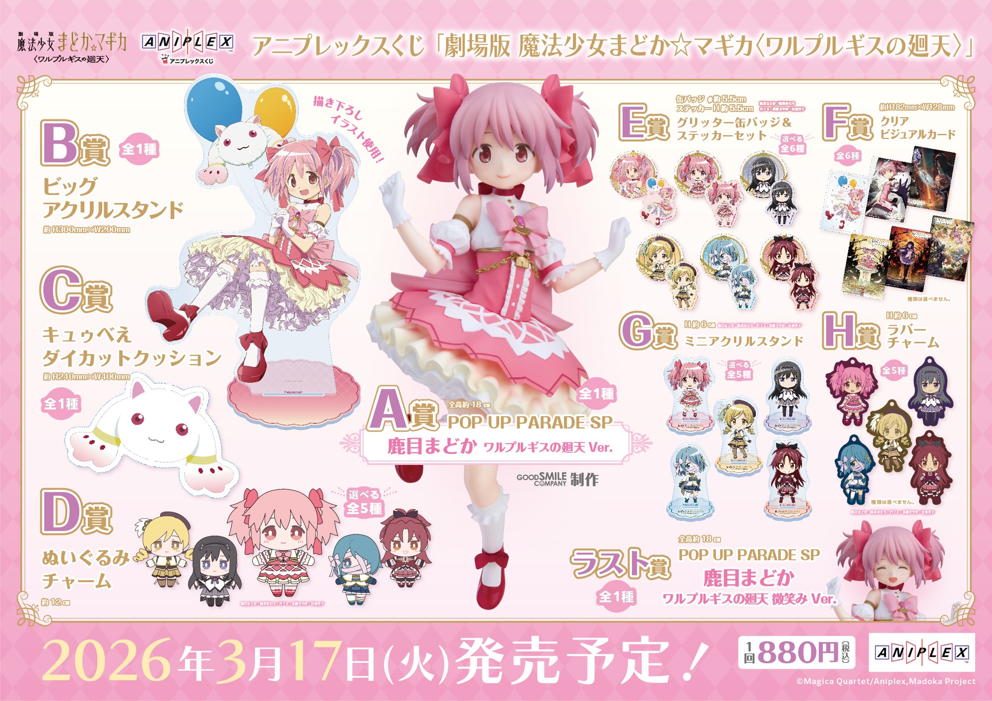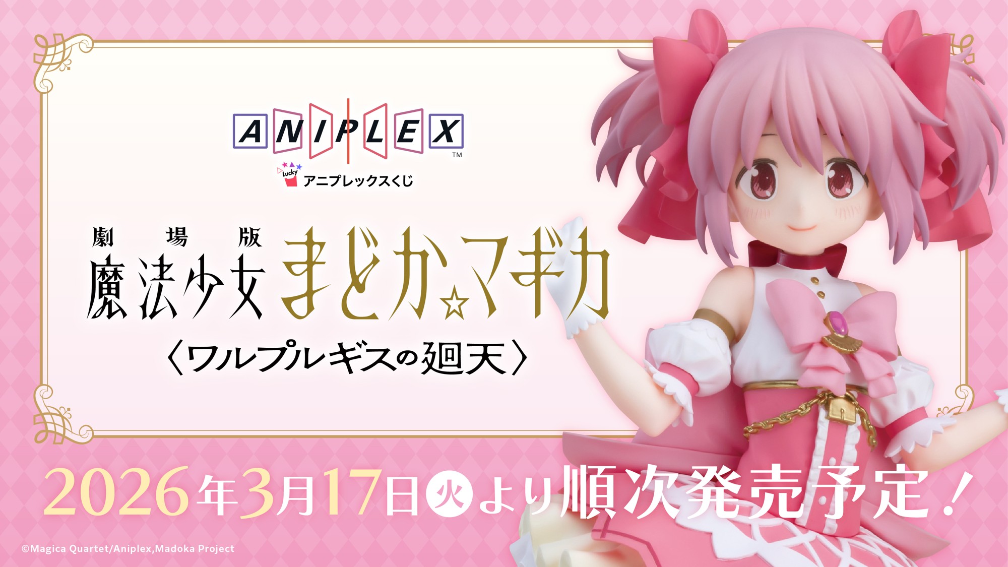 アニプレックスくじ「劇場版 魔法少女まどか☆マギカ〈ワルプルギスの廻天〉」が2026年3月17日より発売。フィギュアや描き下ろしグッズが登場します。