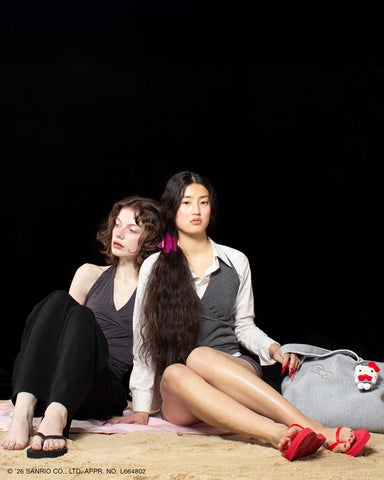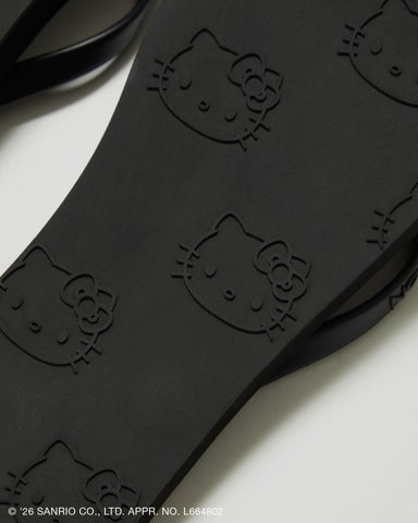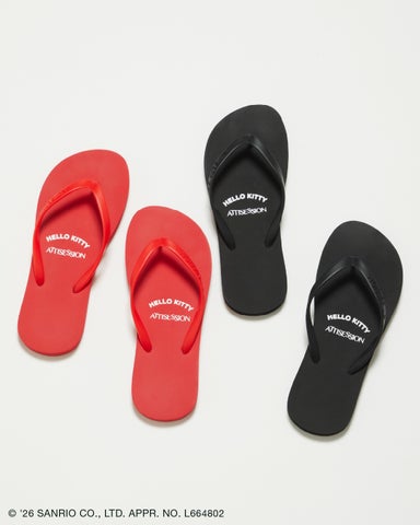 シンプルなデザインながら、見えないところに遊び心を忍ばせたビーチサンダルです。ソール裏にはハローキティの愛らしいフェイスモチーフがあしらわれており、砂浜などを歩くたびにハローキティの足あとが浮かび上がります。シックなブラックと色鮮やかなレッドの2色をラインアップし、リゾートシーンからタウンユースまで活躍する万能な一足です。