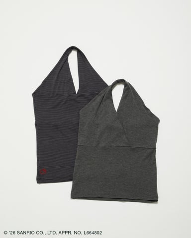肩のラインをすっきりと見せるホルターネックデザインのトップスです。後ろ身頃の左脇にはハローキティの刺繍がさりげなく施されており、大人なムードを演出します。一枚でヘルシーに着こなすことはもちろん、ビスチェ風にレイヤードしたスタイリングもおすすめです。