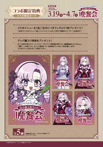また、キュアメイドカフェ店内や同フロアのジーストア・アキバにて「壱百満天原サロメ」関連商品を2,000円(税込)購入・予約ごとに、カフェで配布しているコラボ限定カードをランダムで1枚お渡しします。