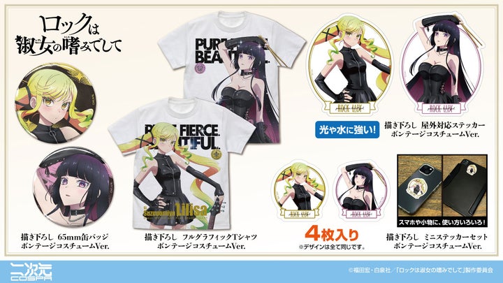 二次元コスパから、『ロックは淑女の嗜みでして』の新規描き下ろしイラストを使用したグッズが登場します。鈴ノ宮りりさ、黒鉄音羽がボンテージコスチュームでアー写撮影をイメージしたデザインです。