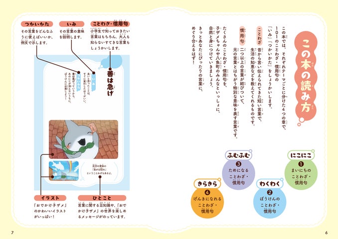 大人気「おでかけ子ザメ」がフルカラー学習書となって登場します。ことわざ・慣用句を癒やされながら楽しく学べる、待望の学習書です。小学生の必須語彙から大人も意外と知らない言葉まで、大切な101のことわざ・慣用句を「おでかけ子ザメ」の物語とともに紹介します。かわいらしくてやさしい子ザメちゃんと、心温まる気持ちになれる構成です。