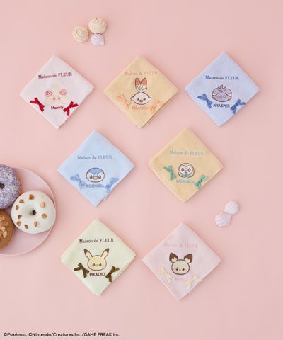 人気のフリルハンドルトートバッグにはツイード素材を使用し、フロントにはピカチュウ、ポッチャマ、マホイップが首を傾げる愛らしい姿を刺繍しました。各キャラクターに合わせたカラーリボンを添えた、同素材のラウンドポーチやタオルハンカチもラインアップします。