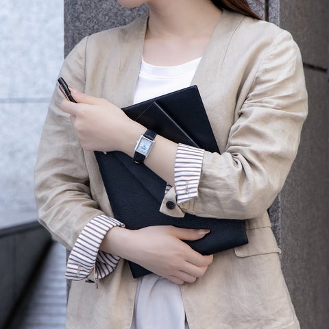 控えめでありながらも上質感を感じさせる仕上がりです。オン・オフを問わずに使用できるジェンダーレスなデザインで、ビジネスからプライベートまで幅広いシーンに対応します。