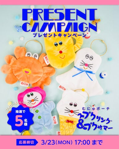 「むにゅポーチ スプクリング&プクサマー」の発売を記念し、コンプリートセットが当たるプレゼントキャンペーンを実施します。抽選で5名に全5種セットをプレゼントします。