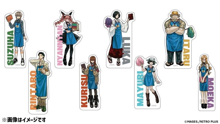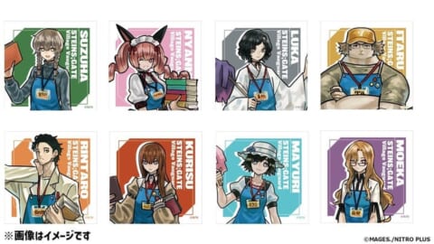 • サイズ: 岡部倫太郎 H10cm×W3.6cm、牧瀬紅莉栖 H8.7cm×W3.3cm、椎名まゆり H8.7cm×W4.2cm、漆原るか H9.1cm×W4.9cm、阿万音鈴羽 H9.1cm×W3.6cm、橋田至 H9.2cm×W5.1cm、フェイリス・ニャンニャン H8.1cm×W4.4cm、桐生萌郁 H8.9cm×W2.6cm