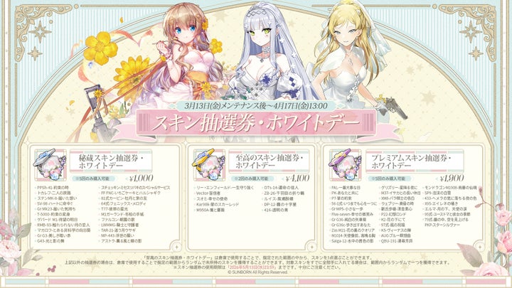 2026年3月13日(金)のメンテナンス後より、様々なウェディングドレススキンを入手できる「スキン抽選券・ホワイトデー」を期間限定で3種類販売しています。