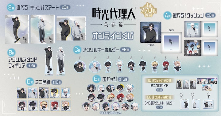 「時光代理人 -LINK CLICK- 英都篇 オンラインくじ」は、オンラインくじサービス「くじ引き堂」にて購入できます。スマホやPCから簡単に参加でき、はずれなしのくじでキャラクターグッズを手に入れるチャンスです。