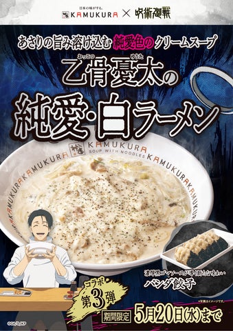 • 特徴: 乙骨憂太の白い制服を表現した、クラムチャウダー味のクリームソースが乗った洋風ラーメンです。玉ねぎの甘みやあさりの旨味が溶け出したクリームに、鶏肉やベーコンを贅沢に使用しました。
