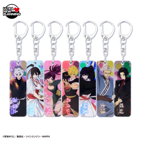 厚みのあるアクリルバーを採用し、透明感と奥行きのあるデザインが特徴のアクリルバーキーホルダーです。ラインナップは、「画眉丸」、「佐切」、「弔兵衛」、「桐馬」、「杠」、「士遠」に加え、2期から登場する「殊現」を含む全7種類を展開します。
