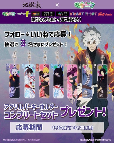 株式会社イオンファンタジーは、TVアニメ『地獄楽2期』のカプセルトイ「地獄楽2期 アクリルバーキーホルダー」を3月19日(木)より当社オリジナル完全キャッシュレスカプセルトイマシン「かぷえぼ」にて順次展開します。