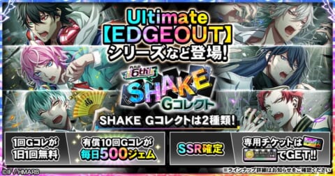 「6th ANNIVERSARY SHAKE Gコレクト」と「6th ANNIVERSARY SSR確定 SHAKE Gコレクト」も、2026年3月17日(火)17:00から2026年3月31日(火)10:59まで実施します。Ultimateカード【EDGEOUT】シリーズなどが手に入るGコレクトです。SHAKE Gコレクトは通常の60%オフで利用できるため、お得です。「6th Anniv. コイン交換」で獲得できる「SHAKE Gコレクトチケット:SSR確定」を使用すると、SSRカードが1枚確定で獲得可能です。