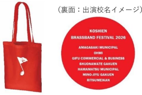 SS指定席には「限定オリジナルバッグ」が特典として付属します。素材はコットン、サイズは本体約33cm×39cm、持ち手約2.5cm×65cmです。裏面には全出演校名が英語表記で印字される予定です。
