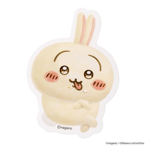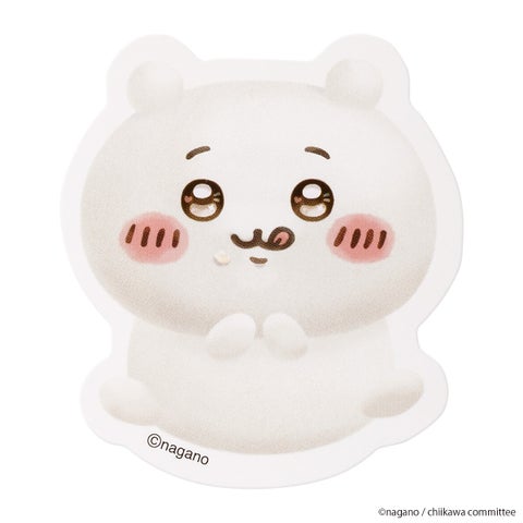 「ちいかわクッキーサンド バナナミルク味」の18枚入には、オリジナルステッカーがランダムで1枚付属します。お口の周りにクッキーをつけた、ちいかわ、ハチワレ、うさぎの愛らしいデザインです。12枚入にはステッカーは付属しません。