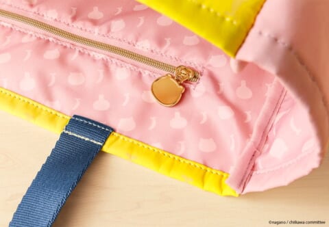 バッグの内側にはちいかわたちと「東京ばな奈」のシルエット柄の生地を使用。小物を入れるのに便利なジッパーには、「ちいかわ」の特製チャームが付いています。さりげないタグも愛らしい、細部までこだわり抜いたトートバッグです。