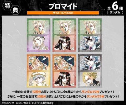 オンラインくじを一度のお会計で10回分購入ごとに特典ブロマイド(全6種)の中からランダムで2枚、20回分購入ごとにランダムで5枚プレゼントします。なお、購入サイトによって特典の絵柄が異なります。