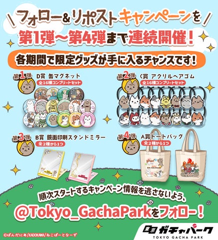 「東京ガチャパーク」のX公式アカウント(@Tokyo_GachaPark)をフォローし、対象の投稿をリポストした方の中から抽選で4名に各賞の商品をプレゼントします。
