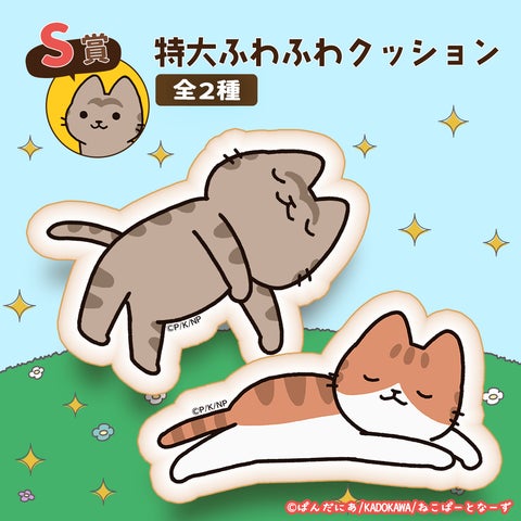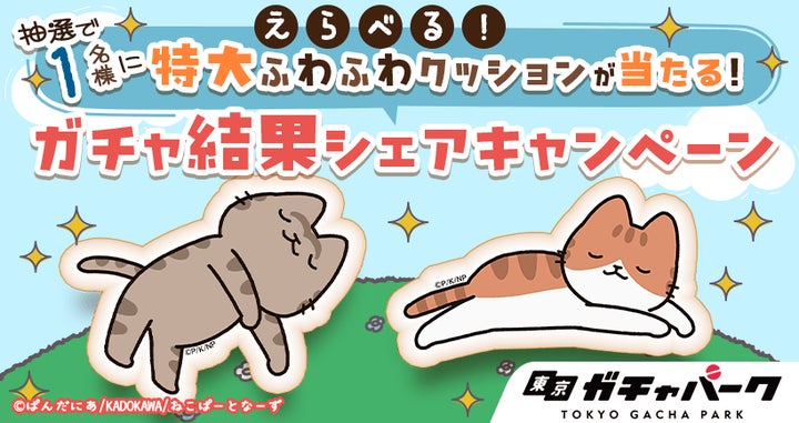 オンラインガチャの開催期間中に「#ねこむかしばなしガチャ結果」のハッシュタグをつけて、当たった景品画像をX(旧Twitter)でシェアした方の中から抽選で1名に特大ふわふわクッションをプレゼントします。キジトラとチャトラから好きな方を選べます。