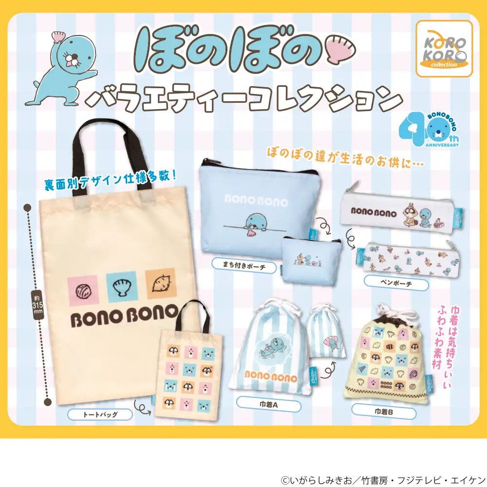 漫画連載40周年、TVアニメ放送10周年を迎える『ぼのぼの』の魅力が詰まった縫製バラエティーコレクションがカプセルトイに登場します。落ち着いた色合いとぼのぼののイラストが可愛い、日常使いに最適なポーチやトートバッグを多数揃えました。