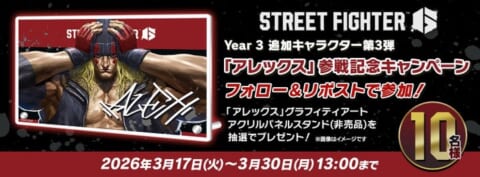 『ストリートファイター6』にて、Year 3追加キャラクター第3弾「アレックス」が2026年3月17日(火)に配信を開始しました。その他、全キャラクター対象のバトルバランス調整、大人気ユニット「JAM Project」とのコラボ、ディージェイとエレナのOutfit 4、そして「ロックマン」シリーズとのコラボイベント、SNSキャンペーンも同日より実施します。