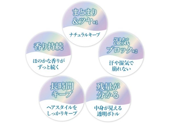- まとまり&ツヤ: スタイルをキープし、ツヤを与えます。